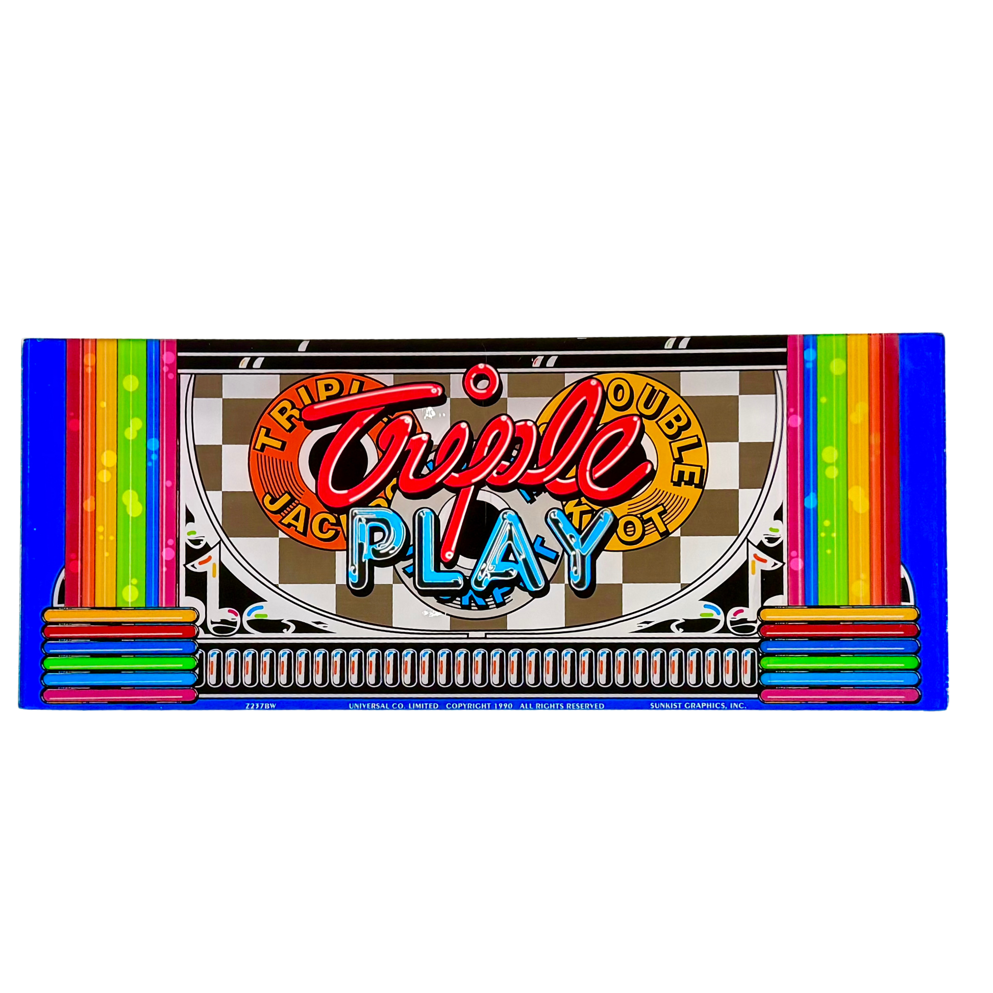Introducing the Triple Play Slot Glass, a vibrant and eye-catching piece that captures the retro casino aesthetic with its bold neon lettering and dynamic design. Featuring a classic Triple Double Jackpot theme, this slot glass brings a nostalgic touch with its checkered background and colorful rainbow-style accents on the sides, evoking the energetic atmosphere of vintage gaming floors.