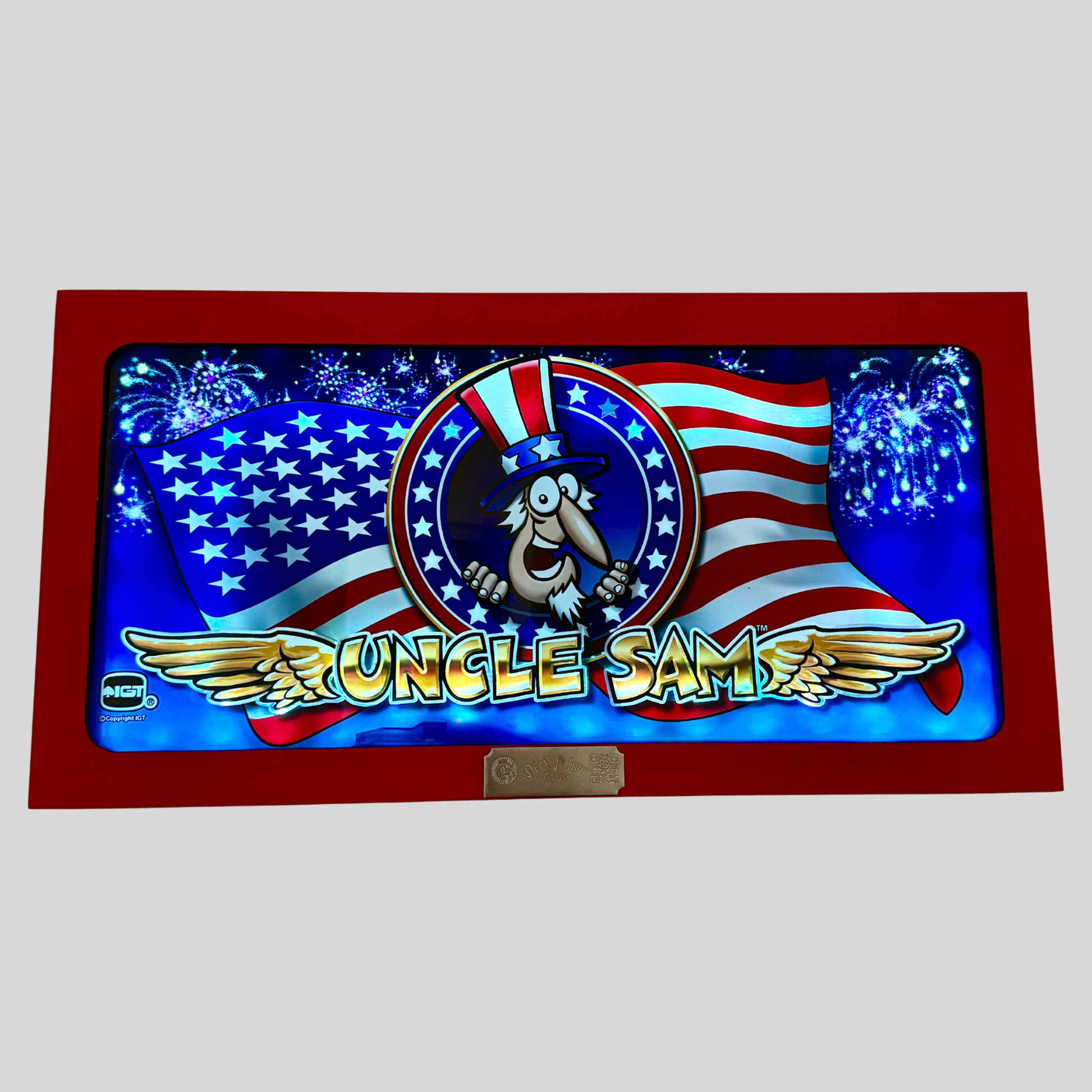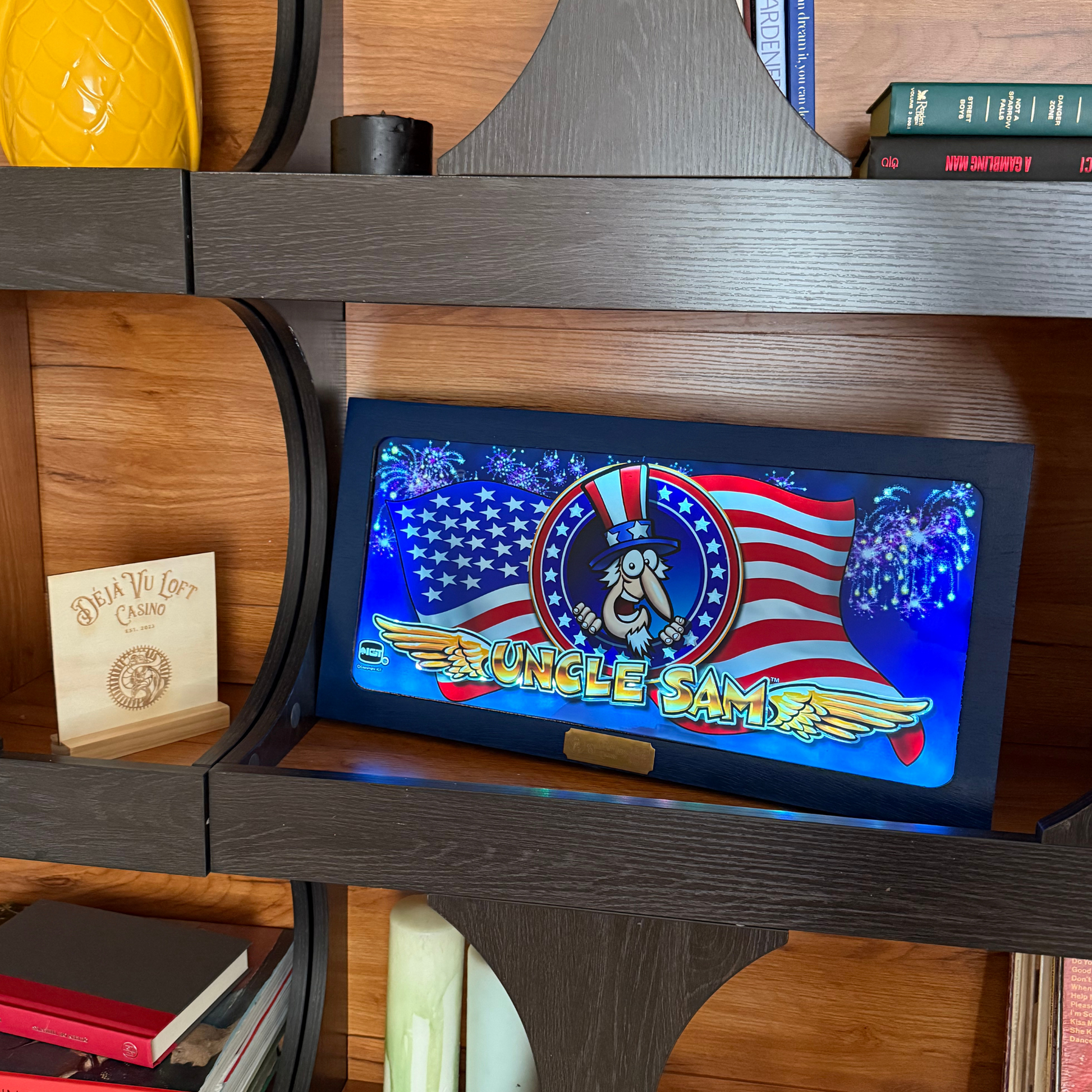 Show off your patriotic spirit with the bold and vibrant Uncle Sam Vintage Slot Machine Glass! This eye-catching piece features a whimsical cartoon Uncle Sam set against a backdrop of the American flag, complete with golden wings and celebratory fireworks. The striking red, white, and blue design makes this glass a standout addition to any game room, home bar, or vintage Americana decor collection. Celebrate freedom, fun, and big wins with this nostalgic tribute to the land of opportunity!